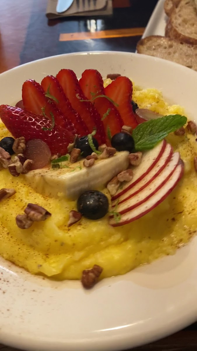 The menu stays true to straightforward, quality ingredients with a focus on breakfast and light lunch options like grilled paninis (turkey with provolone, ham with gruyere, or a vegan seasonal veggie choice) and vegetarian soups. The bowls of fresh fruit are given a thoughtful twist, such as a hint of citrus zest, that keeps things fresh without overt complexity. Items like avocado toast and scrambled eggs on croissants feel homemade and satisfyingly wholesome, appealing to those who want a meal that feels nurturing but not heavy on butter or grease.